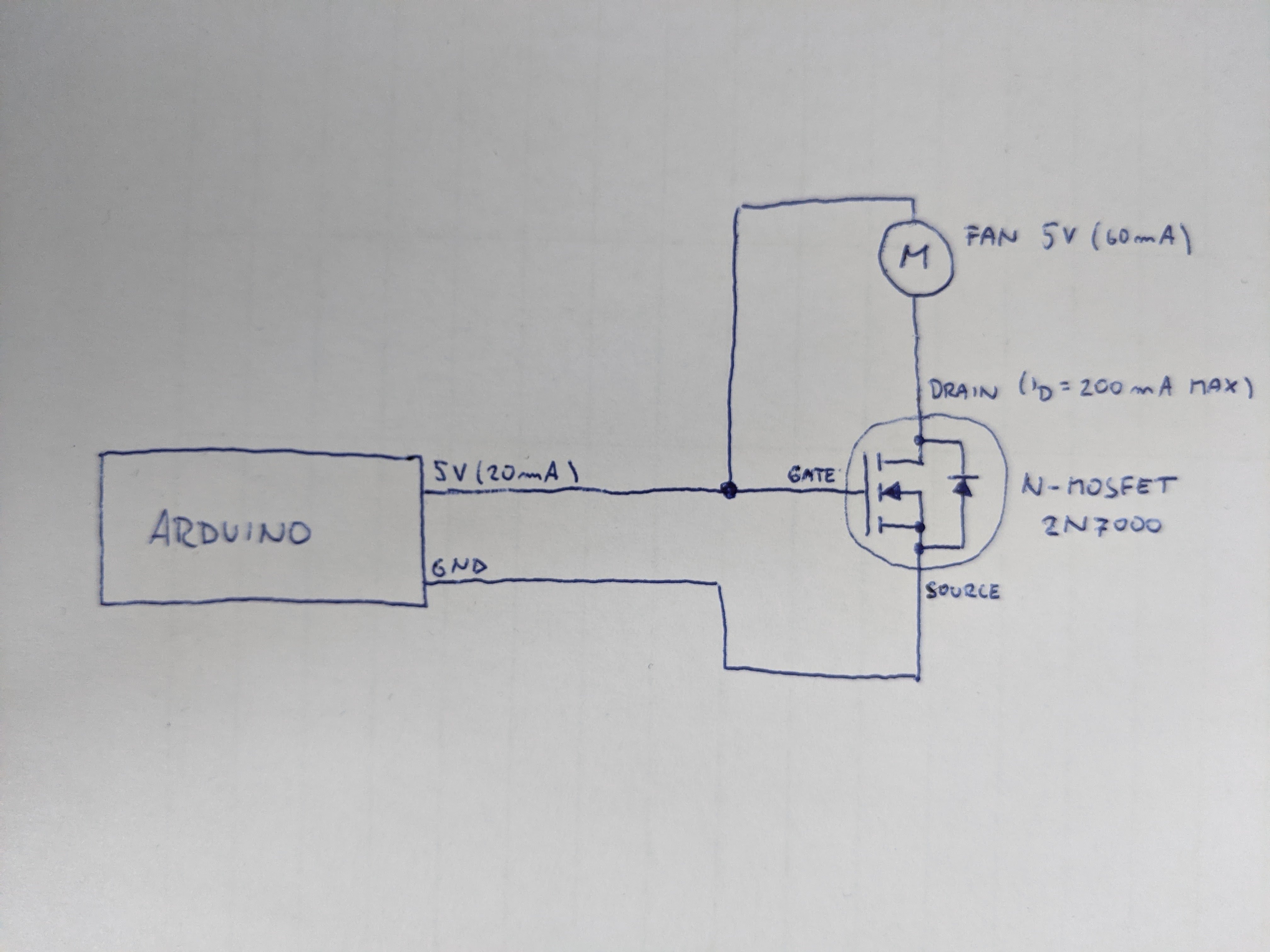 Chtěl bych vás poprosit o pomoc se zapojením a napájením malého ventilátoru (15x15x4mm, 5V, 60mA) pomocí Arduino NANOv3, resp. použitím PIN 27 (5V, 20mA) k napájení uvedeného ventilátoru. Tuto problematiku částečně řeší Jacob Dykstra na svém YT kanálu. Ve zkratce, vzhledem k nízkému výstupnímu proudu z Arduina je třeba přivézt 5V z PINu 27 na gate N-MOSFETu (např. 2N7000), source N-MOSFETu napojit na GND, drain pak napojit na černý vodič ventilátoru a červený vodič napojuje Jacob na 12V externí zdroj (používá větší ventilátor). Tady přichází můj dotaz. Nechci používat externí zdroj ale pouze Arduino k napájení mého micro ventilátoru. Proto bych červený vodič ventilátoru napojil na 5V PIN 27 (ze kterého je vedeno napětí do N-MOSFETu). Byl by tento setup funkční? Nebo bych měl ještě zahrnout zapojení resistorů? Přikládám schéma zapojení.