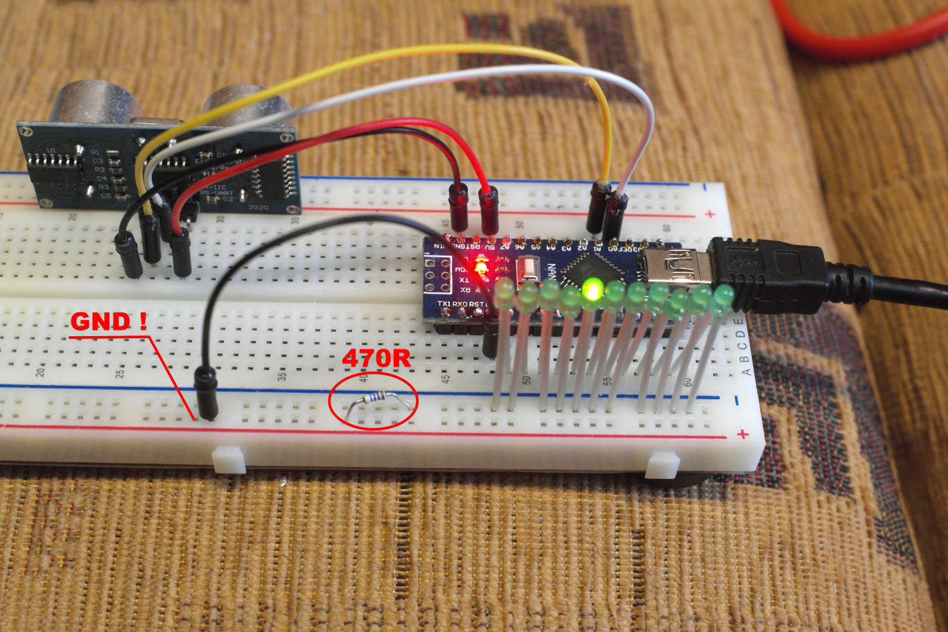 Podle změřené vzdálenosti se postupně rozsvěcují jednotlivé LED ve sloupci. Každá LED svítí v určitém intervalu. Například LED 50 cm svítí od 50cm do 59 cm a navazující LED 60 cm svítí od 60 cm do 69 cm. V případě, že je vzdálenost větší než 400 cm nebo se signál od překážky dostatečně neodráží, začne blikat poslední LED-D12 ve sloupci. Pochopitelně je možné deklarované LED libovolně vypustit a do obvodu je neosadit. LED je nutné na výstupy Arduina zapojit s odpovídajícími rezistory proti GND, hodnota 470ohmů vyhovuje. LED se připojují anodou na výstupy Arduina. Protože program ve sloupci rozsvěcuje vždy pouze jednu LED, je možné spojit všechny katody těchto diod na jediný rezistor a ten pak zapojit na GND. To dovoluje velmi jednoduché zapojení obvodu na kontaktním poli pro experimenty. Na použitou knihovnu pro obvod HC-SR04 je odkaz přímo v programu. Ta počítá i s případnou teplotní kompenzaci měřené vzdálenosti.