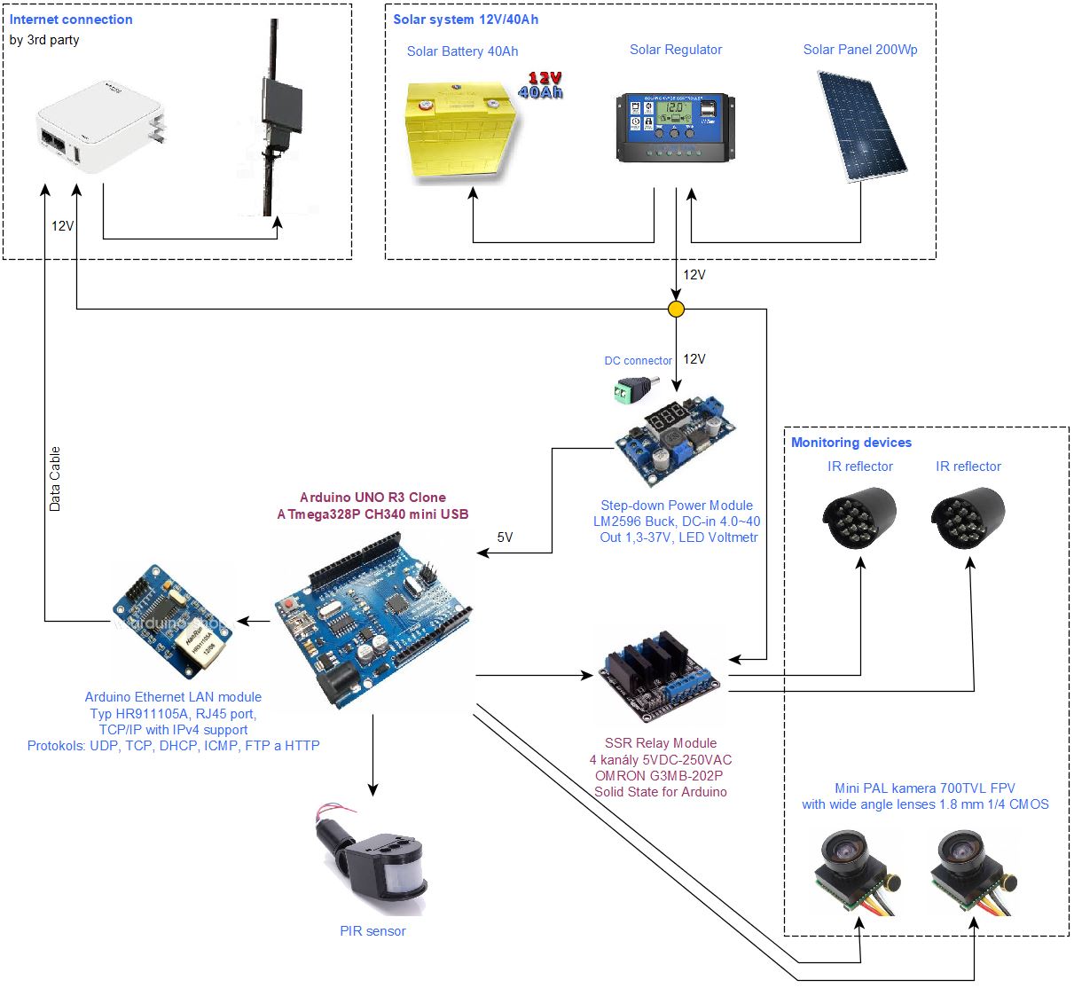 nenašel jsem vhodnější a obecnější kategorii fóra než je tato. Poprosil bych o radu, zda je navržená sestava realistická. S elektronikou mám zkušenosti pouze okrajové a byť se o Arduino zajímám už nějakou dobu, na otázky kompatibility a vhodnosti řešení nemám žádné zkušenosti. Nějak začít musím a důvod pro následující malý projekt je ten, že potřebuji sestavu, která bude dobře fungovat off-grid z akumulátorů. Sestavení z hotových komponent kamerových systémů tohle nesplňuje, v takové sestavě jsou zbytečné prvky a např. IR přisvícení funguje neustále s relativně významným odběrem energie. To pak s běžným malým solárním systémem nevychází, akumulátor nevystačí.