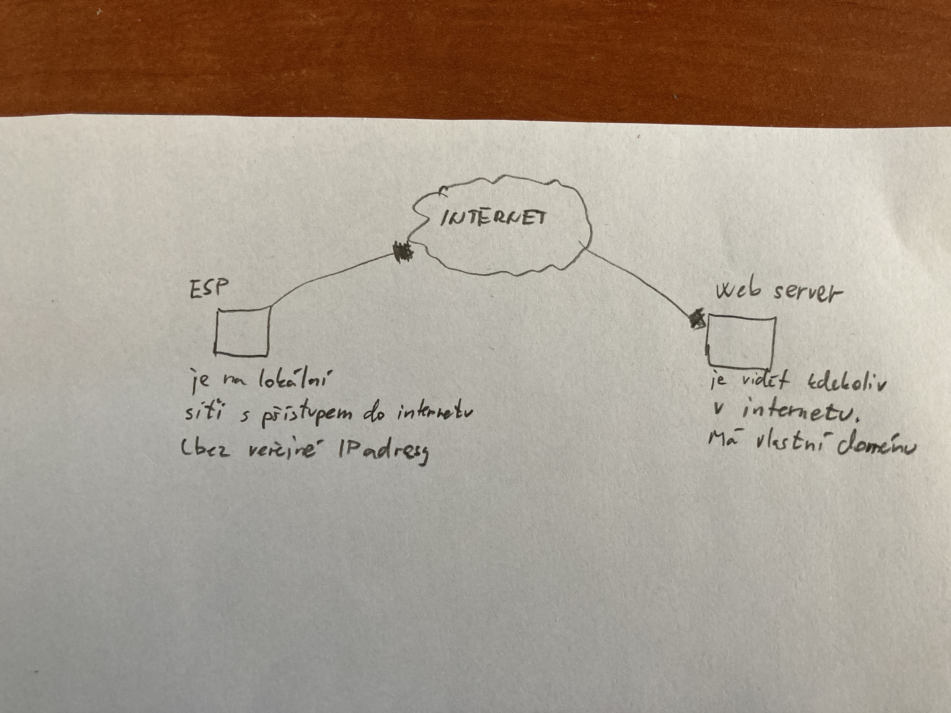 V příloze jsem se snažil nakreslit jak to mám udělané. ESP web server vidí ale pokud bych se měl odrazovat z web serveru na ESP, tak to nepůjde (asi to je prave to co nevím jak udělat). Obě zařízení jsou na jiném místě. Šlo by udělat spojení napr. i přes websocket?