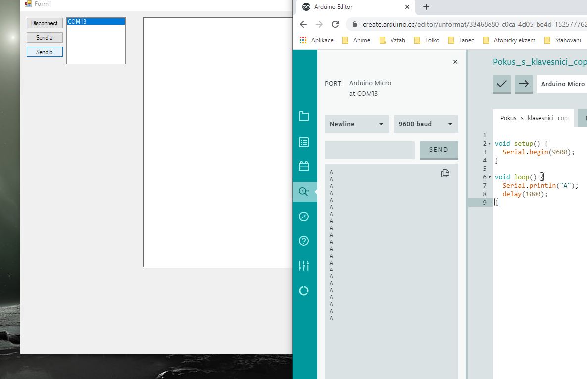 Když si napíšu velice jednoduchý prográmek, který mi bude posílat na sériovou linku např. každou 1s písmeno "A". Otevřu si v IDE serial motitor, tak budu vidět že se na sériovou linku posílá každou 1s písmeno "A". Zavřu si serial monitor a otevřu si program (napsaný v C#) který mi bude pouze zobrazovat data ze sériové linky, tak mi neukáže vůbec nic.