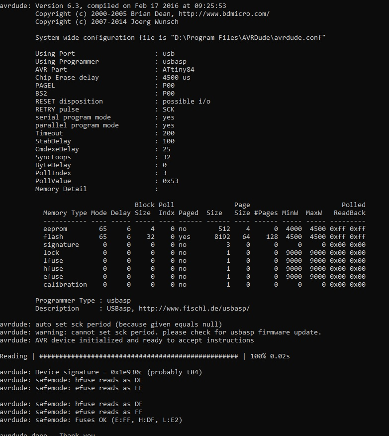 avrdude: safemode: Fuses OK (E:FD, H:DA, L:FF)