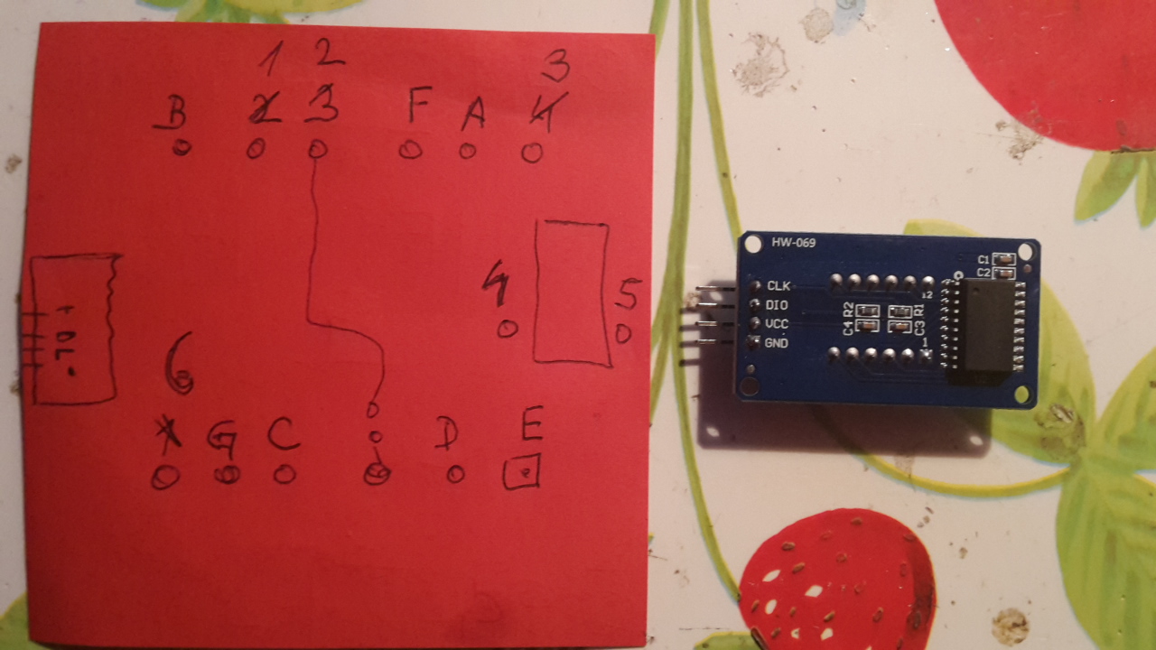 Původní display vyletujeme a zapojení je na přiloženém obrázku. Škrtnuté čísla společných Anod jsou pro variantu 4 displayů.