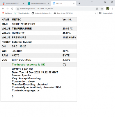 Oprášil jsem svůj starý projekt barometru. S ohledem na docela vysokou cenu čidla BME280 jsem zvolil dvojici čidel BMP280 a SHT40, které i v součtu vyjdou na třetinu ceny BME280. A pro snadnou konstrukci jsem zvolil klon Wemos D1 mini. Pak stačí připojit k čidlům napájení a signály SDA, SCL, strčit to do nějaké krabičky. Tady musím jen připomenout, že ESP8266 dost hřeje a je třeba s tím při mechanické konstrukci počítat. Chystám sice ještě nějaká vylepšení, ale je to jinak komplet hotové. Poprvé jsem pro ESP8266 použil asynchronní http server a je to opravdu znát. Odezva je skvělá. Nemá to displej. Výstupy jsou tři.