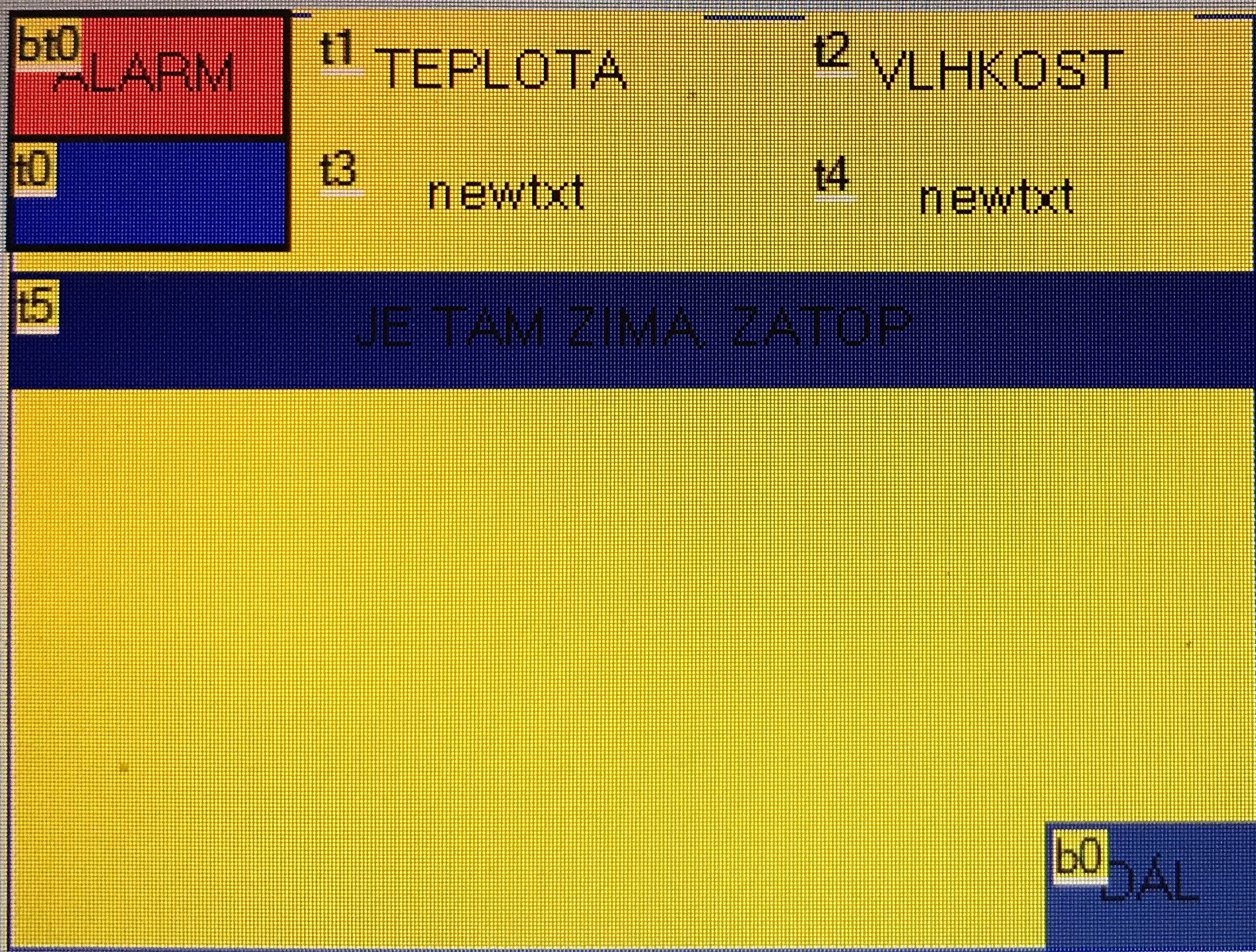 Dobrý den, chtěl bych se poradit, protože si už fakt nevím rady. Mám displej Nextion 2.8" NX3224T028 TFT LCD a program kde příjmu data od druhého arduina kde mám senzor DHT11 a BMP280 a chci je vypsat na displeji. Je zapojený dobře a zkoušel jsem i zkušební program na to a funguje jak má, ale jak tam chci vypsat ty hodnoty ze senzoru tak to prostě nic neukazuje, takže jsem odvodil chybu v programu nějakou, ale nevím jaká to je. Můžete mi prosím poradit? Trochu to spěchá do školy. Posílám program i obrázek grafického prostředí toho displeje. Předem děkuji za rady.