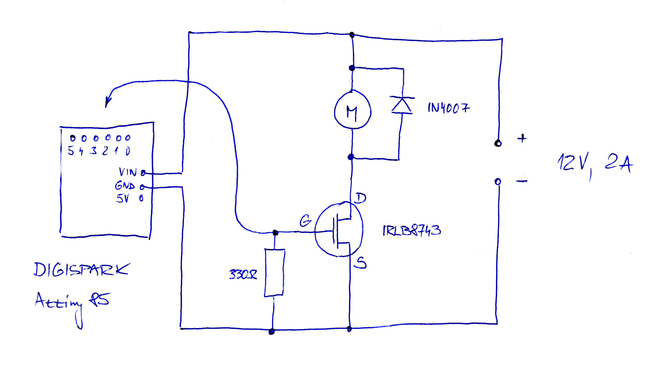 Stavoval jsem se to dneska prodiskutovat na fakultě a vymysleli jsme tohle, abych nemusel řešit zvlášť napájení pro Arduino a pro motorek. Je to takto, prosím, ok? Je možné, že tam mám chybu v odporu, dostal jsem dva a teď si nejsem jistý, jestli tam nepatří 100k. Prý mi bude pro tuto aplikaci stačit úplně nejmenší Digispark...