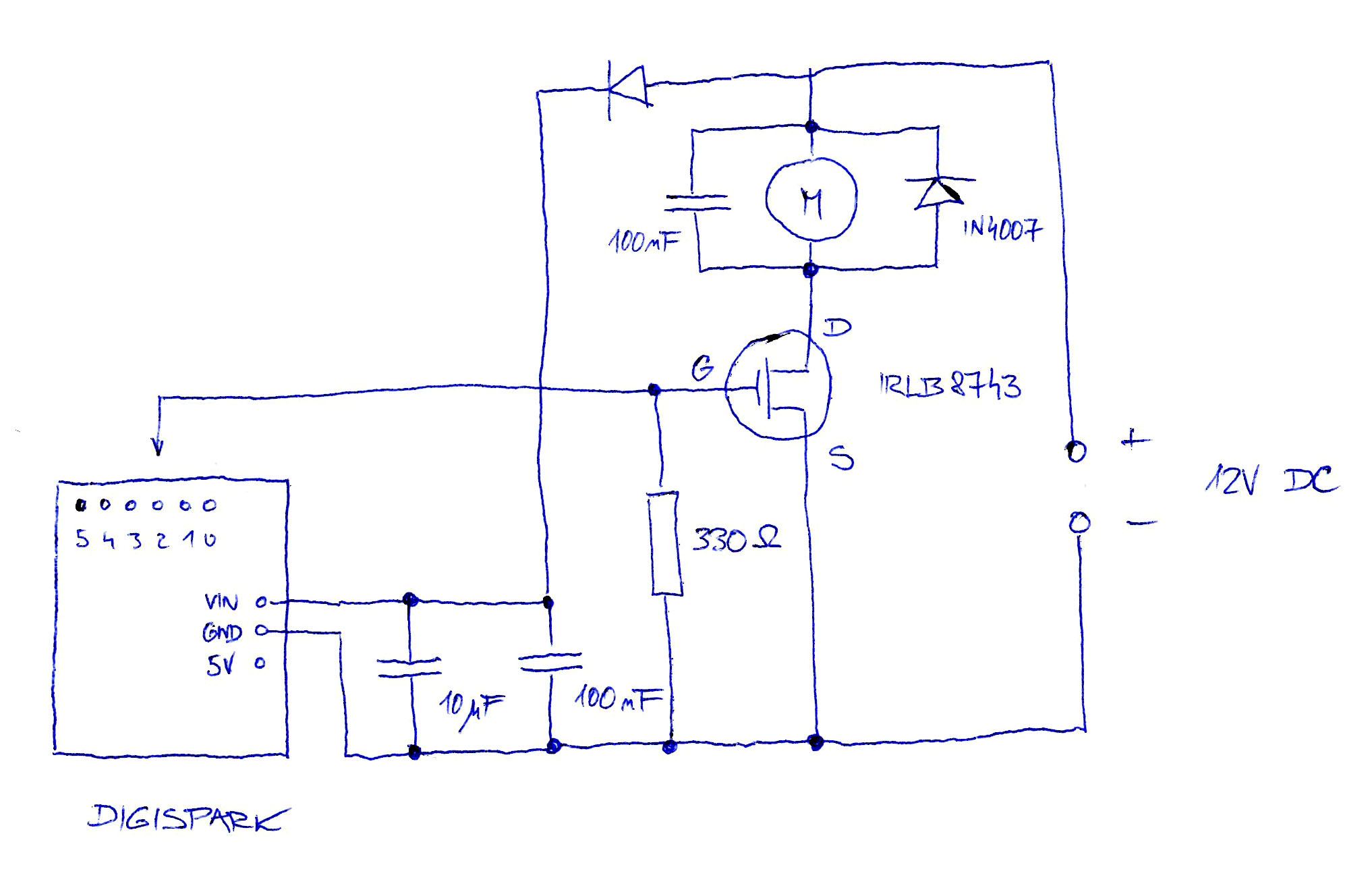 Mezi + motoru a těmi kondenzátory u VIN musí být dioda, aby motor při rozběhu bral proud ze zdroje a ne z těch filtrovacích kondenzátorů - ty jsou tam také i proto, aby pomohli arduinu překonat pokles napětí na zdroji při spuštění motoru.