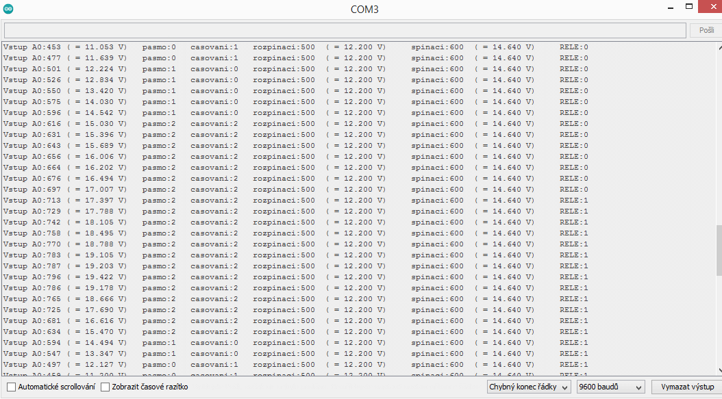 V případě 12V aku by to třeba bylo při 12,5V vypni a při 14,4V zapni. Výstup Arduina ovládá relátko.