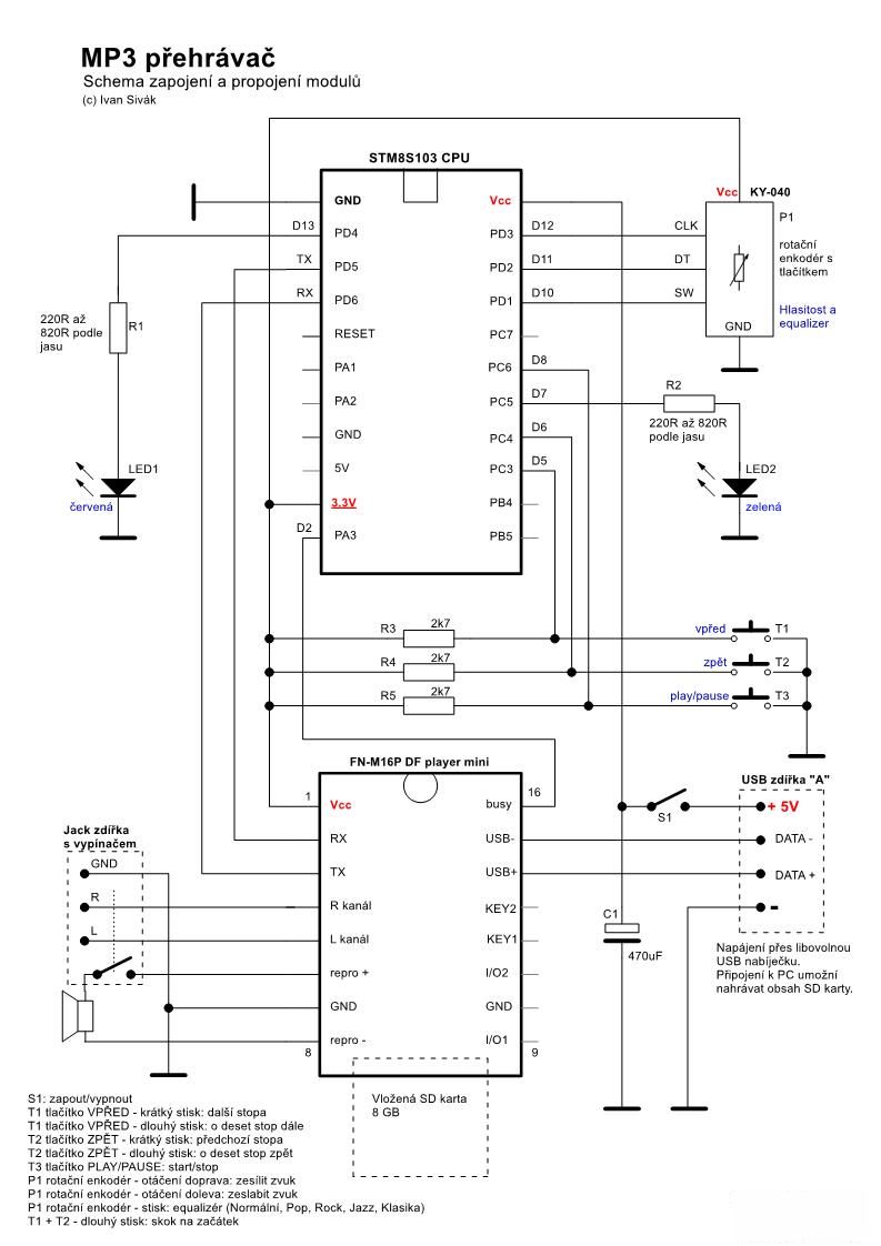 Zaujal mne malý, levný a přitom výkonný modul pro přehrávání souborů MP3 DFPlayer. Lze jej použít i samostatně, zde mi však vadí jeho ovládání. Krátký stisk tlačítka posune na další/předchozí soubor a dlouhý stisk zesílí/zeslabí hlasitost. Ovládání hlasitosti jinak, než "kolečkem" mi připadá neohrabané, nehledě k tomu, že se například snadno může stát, že místo zeslabení, se posunete o soubor zpět (nebo opačně) . Navíc je zde možnost ovládání rozšířit o další možnosti, viz schéma.