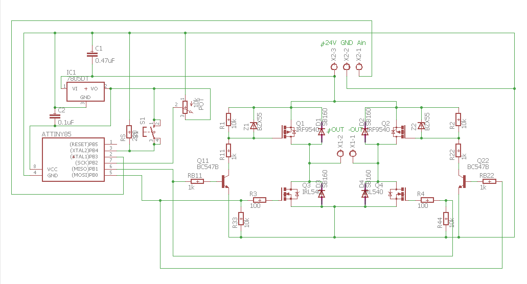 Zdravim, potreboval by som pomoc so spravnou funkcnostou zapojenia. Pri zapojeni v arduine je regulacia aj zmena polarity funkcna a plynula ale ak zapojenie bezi na attiny85, tak regulacia zo zaciatku nieje plynula a su enormne prudove skoky. poprosil by som vas o radu je tu aj program aj schema aj video spravania oboch pripadov.program je z arduina , na attiny je totozny akurat vstupy/vystupy maju zodpovedajuce piny.Robi to pri zatazi indukcnej(motor), pri odporovej to nerobi.
