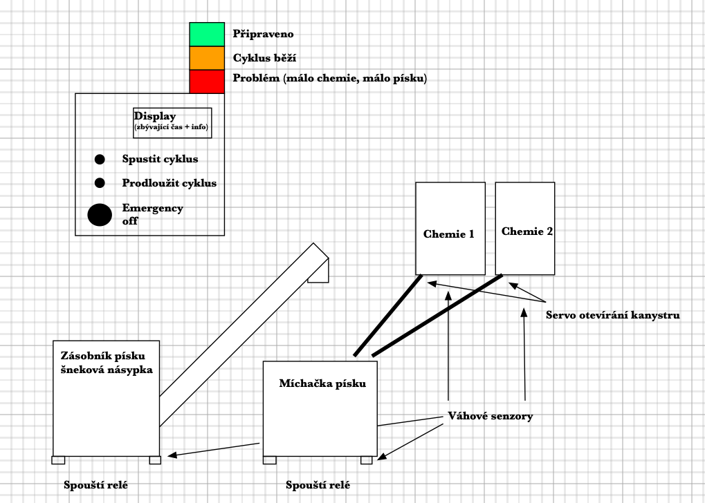 Jedná se o spouštění šnekové násypky na písek, dávkování chemie do mísiče a spouštění mísiče. odvažování všeho přes váhové senzory. viz náčrt v příloze