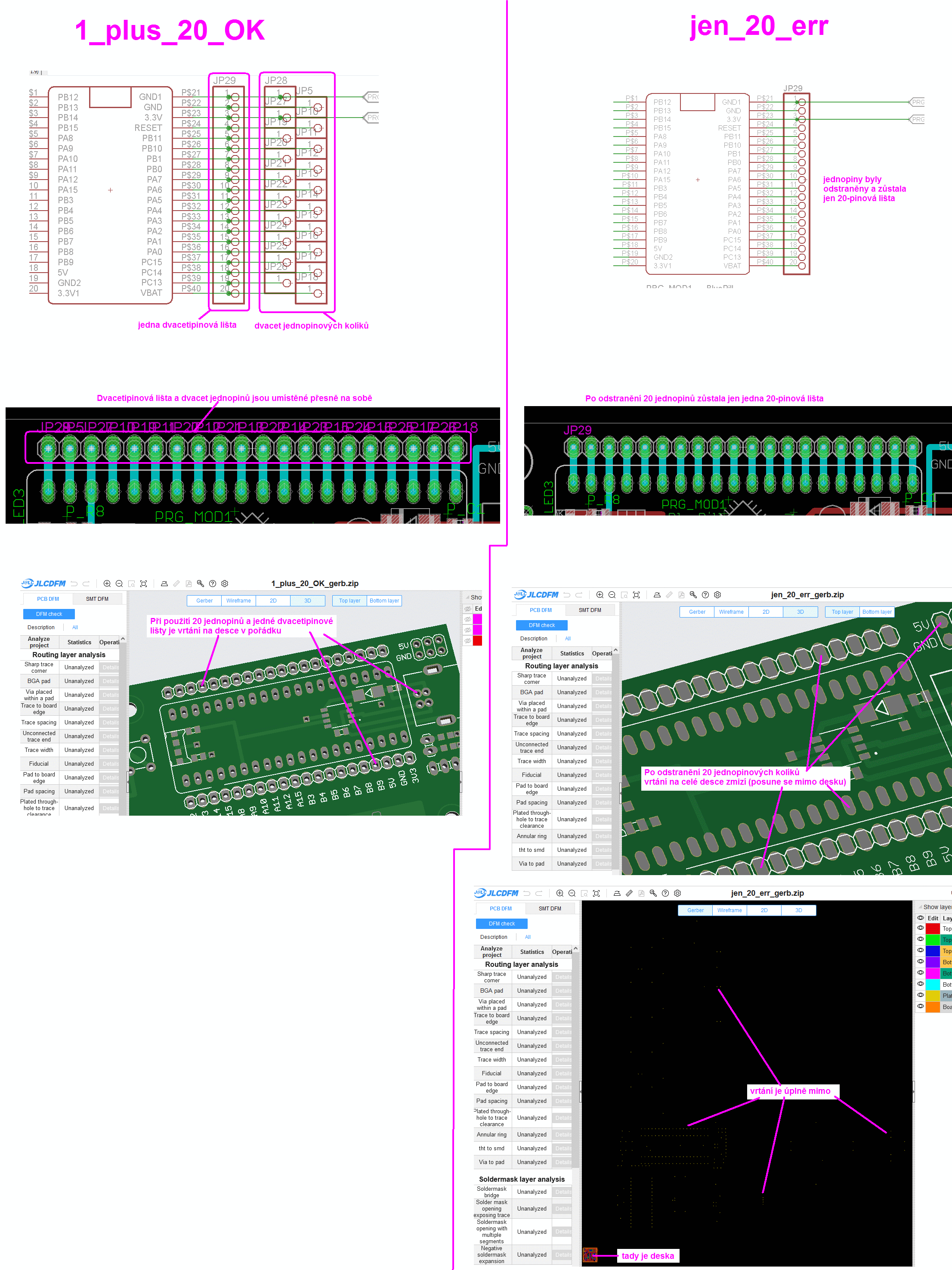 Když ale v tomto stavu odeberu těch 20 jednopinů a nechám tam jen tu dvacetipinovou lištu, DFM kontrola se zblázní a veškeré vrtání vyhodí