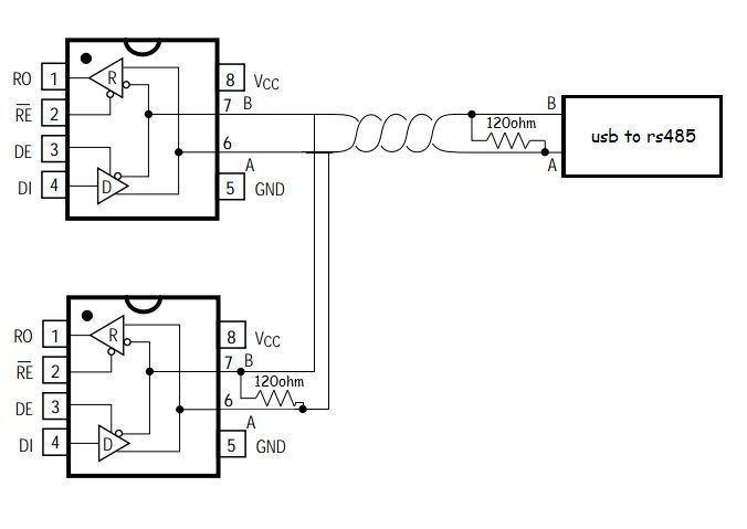 Jenom poznámka, máš zapojeny zakončovací odpory na vedení 120ohm.