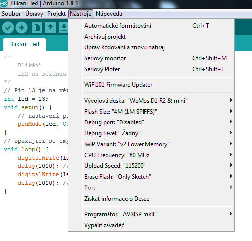 Nahrál jsem do Arduina program wifi scan a v sériovém monitoru jsem viděl seznam bodů i signálů. Když jsem do desky nahrál program s blikáním integrované led diody, také blikala. Bohužel když se ale chci dostat do ovládacího panelu skrze prohlížeč, nedostanu se nikam.