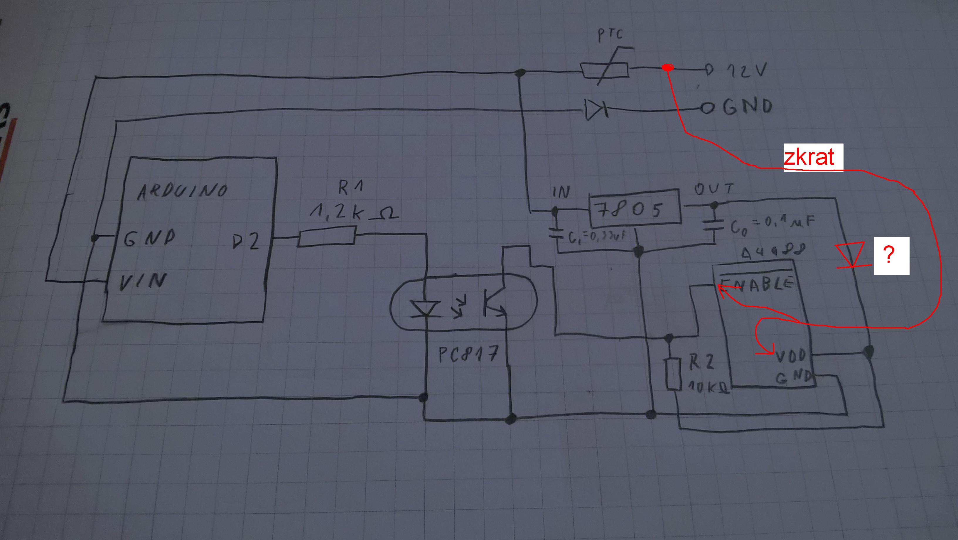 - co se stane, kdyby nastal zkrat jak je naznačeno červenou šipkou? Odešel by Optočlen? (Ano, Nelze říct, Ne) Odešel by regulator 7805? (Ano, Nelze říct, Ne)