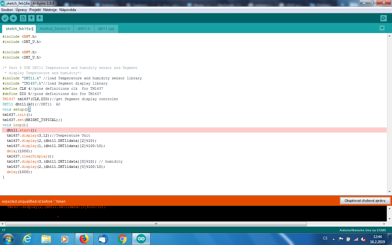 Potřeboval bych prosím poradit kde by mohla být chyba, jde o teploměr a displej - Nastala chyba při kompilaci u desky Arduino/Genuino Uno.