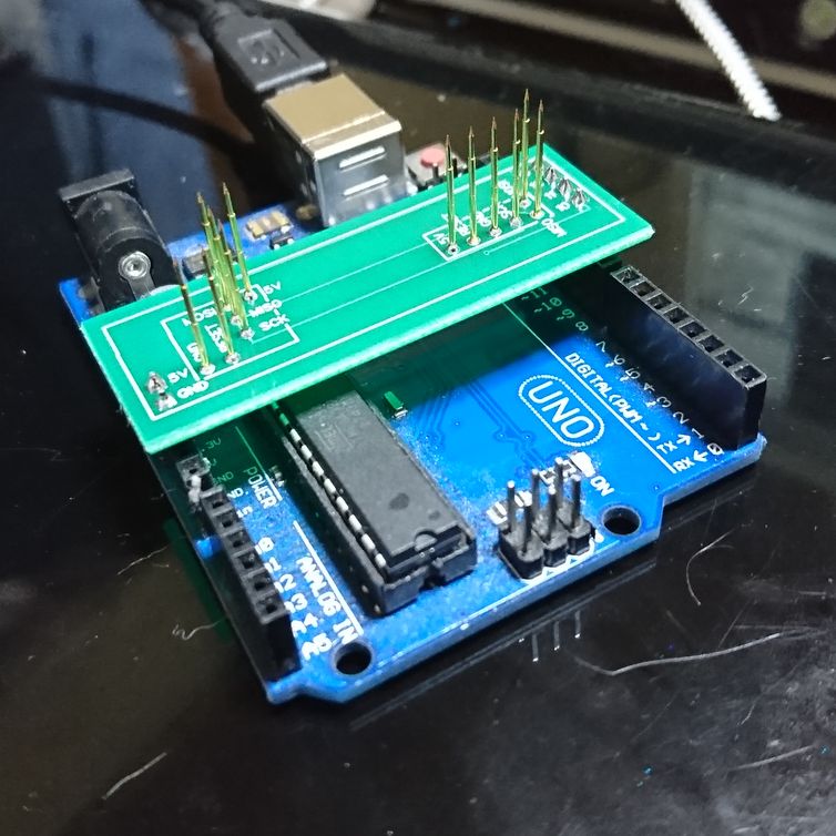 pak jsem ale objevil tyhle testovací piny s pružinou (používám ty P50-B1) a header není potřeba - stačí si na pcb rozmístit kontaktní body (díra 0,4mm) v konfiguraci odpovídající shieldu.. ^_^ dělal jsem to na rozteč 2,54mm, protože jsem chtěl shield postavit na univerzálním pcb, ale pak jsem si všiml, že arduino uno má mezi piny 7 a 8 nestandardní rozteč, takže bylo nutné vyrobit si pcb..
