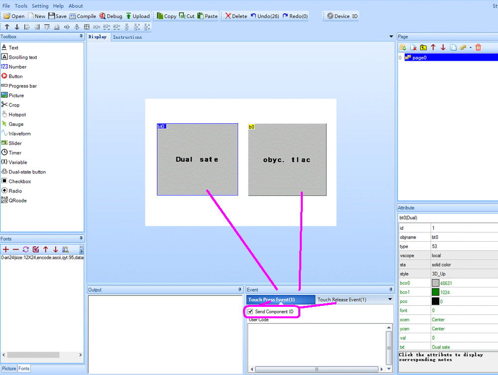 Mám na displeji vytvořena dvě tlačítka (objekty). Tyto objekty jsem na displeji vytvořil v editoru.