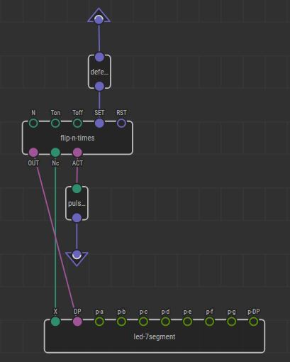 Ukážu to na triviálním příkladu převodu dekadického čísla na BCD (binární) kód. Timer "flip-n-times" je nastavený tak, že počítá od 0 do 15 (a pak znova od začátku) a výstupem Nc posílá každé 2 vteřiny ta čísla na převodník nazvaný "bcd-kod-2", který je převede na zmíněný bcd kód (ten převodník jsem napsal v C++ a pokud chcete vidět, jak pracuje, stačí na ten node 2x kliknout). Výsledek dekódování se objeví v okénkách "Bin" jako logické hodnoty true a false, v "Dec" je pro kontrolu to dekadické číslo. Ta okénka jsou nody zvané "watch" a normálně by místo nich asi byly nody "led", ve kterých bychom nastavili, z jakého pinu bude každá skutečná ledka řízena. Jenže nyní