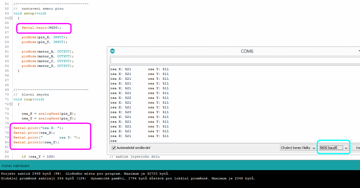 Doplnění výpisu těch proměnných hodně zpomalí program, takže se motor bude točit výrazně pomaleji.