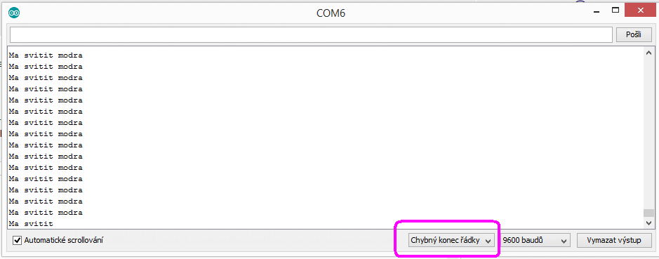 Aby to fungovalo, musíš mít v sériovém monitoru nastaveno "Chybný konec řádky".