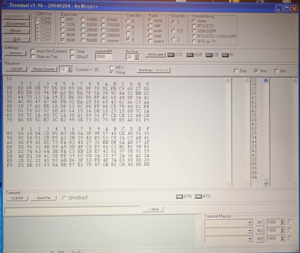 Hodně času jsem věnoval pokusům dosáhnout použitelný port a konečně se zadařilo. Jak jsem toho dosáhl nedokážu popsat, pokusů bylo takové množství a výsledky nejednoznačné, nebo alespoň z mého pohledu nepochopené. Nejprve jsem komunikoval jen přes porty 8 a11, což bylo použitelné jen pro funkci copy, ale nakonec se mi podařilo zprovoznit port číslo 3 a umožní mi tak i komunikaci s terminálem. Ten používám hlavně pro výpisy paměti a větší objemy dat, co nevejdou na LCD displej.