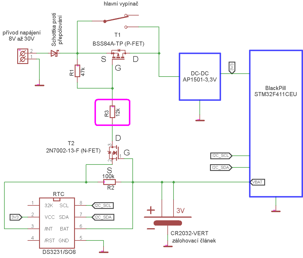 Jestli to správně chápu, tak I2C z aktivního stavu přepne /INT do rozepnutého, následkem čehož se začne rozepínat ten N-FET an než se rozepne, tak máš přesně ten případ, kerý nemůže nastat.I když bude hlavní vypínač vypnutý, tak se v nastavený čas zařízení probudí, něco vykoná (něco změří, nebo zapípá jako budík) a přes I2C se přepne /INT výstup RTC obvodu do neaktivního stavu (otevřený "kolektor") a tím se zase zařízení vypne.