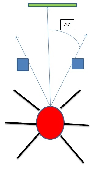 Vracím se k problému narážení dlouhých nožiček pavoučka do překážek které nejsou přímo před ultrazvukovým sensorem. Ten má na vzdálenost 50 cm rozsah asi 12-15 cm (kužel s vrcholovým úhlem cca 15°. Z obrázku je jasné že "rozpětí" nožiček je mnohem větší - cca 40 cm.