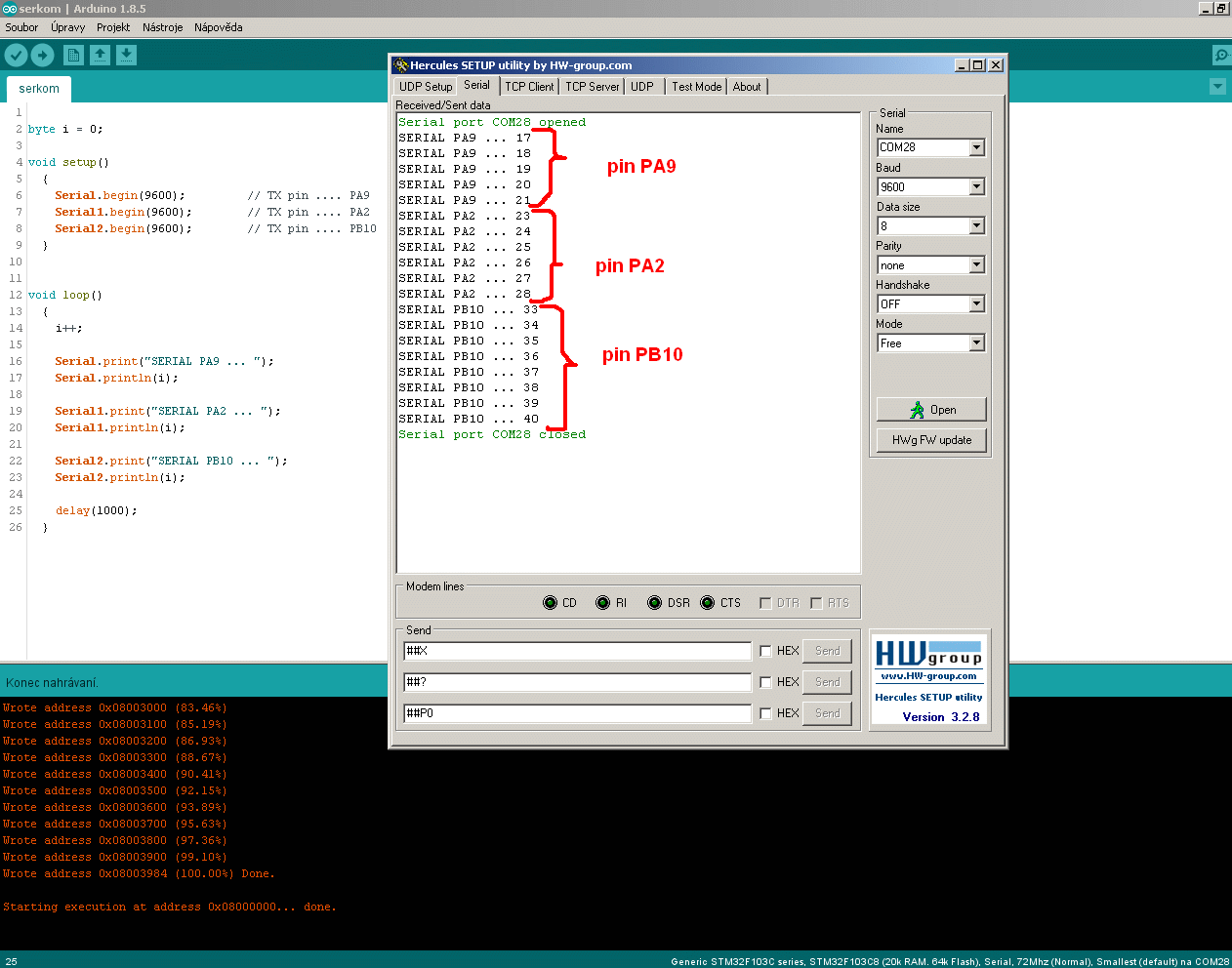 }Když ten program do desky nahraju v prostředí Arduino přes obyčejný USB/TTL převodník (převodník s čipem CH340 je při nahrávání připojený na piny PA9 a PA10), tak po spuštění program pracuje podle očekávání. Na výstupech PA9, PA2 a PB10 se objevují zprávy, které odpovídají pinům (viz obrázky níže).