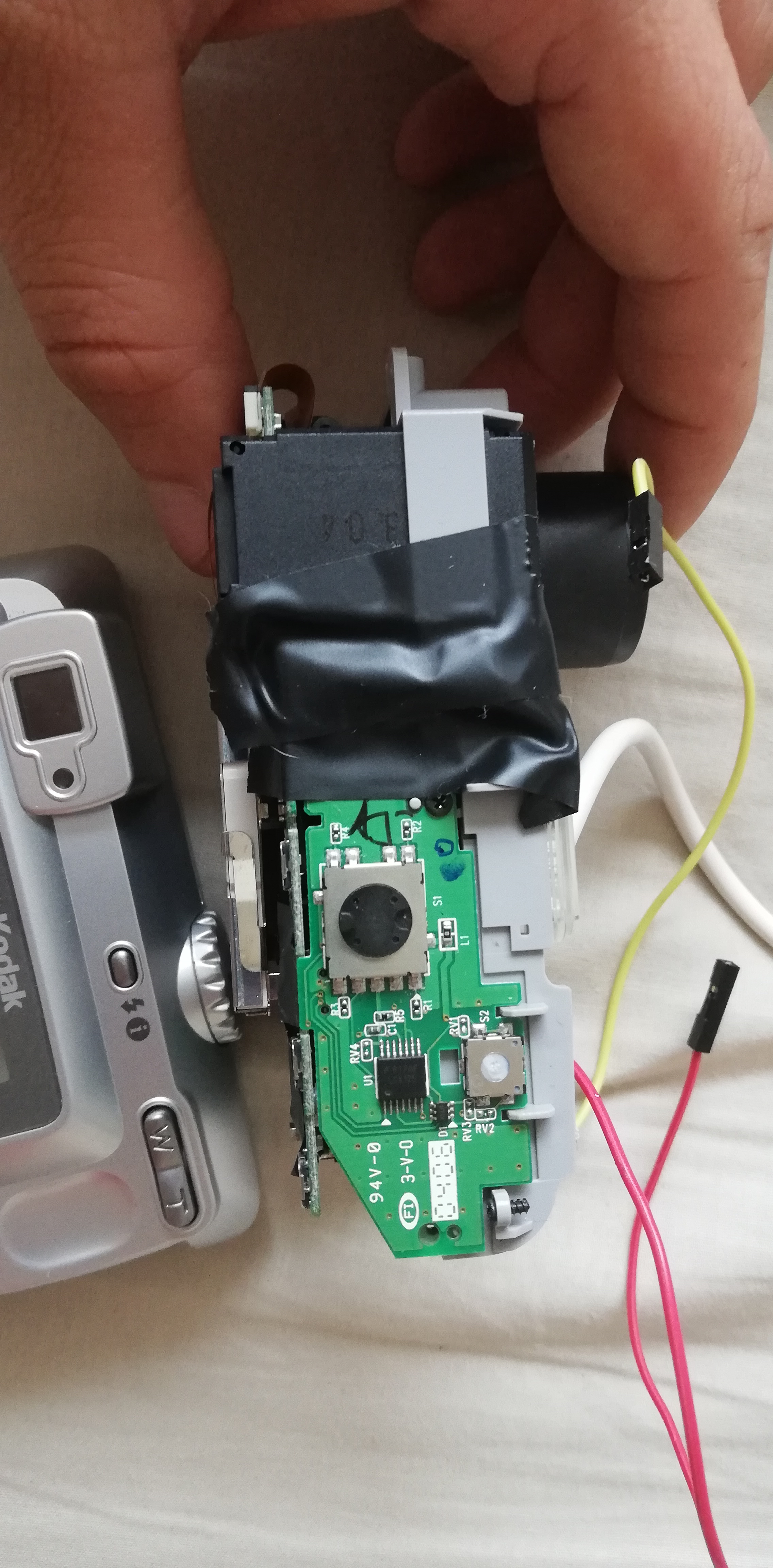 Vzal jsem starý fotoaparát, ten jsem rozdelal a z čipu odstranil IR filtr, aby fotoaparát fungoval i v noci s IR prisvitem. Přisvit i pohybové senzory mám koupené a vše odzkoušené.