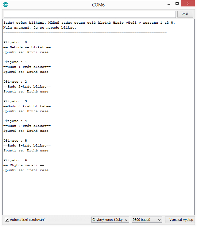 Už jsem na to přišel, mám to špatně naprogramované. Třetí CASE se spustí až při hodnotě větší, než je nastavená v maxBlik, což má být hodnota pro omezení zadání. neuvědomil jsem si, že tím pádem mi to ovlivní i příkaz SWITCH. Musím to předělat. 0 = zastavit blikání, 1 - zadaná hodnota v rozsahu 1 - maxBlik, podle toho tolikrát blikej a 2 je pro chybné zadání. Dal jsem prostě dohromady jablka a hrušky... A co se týče desetinného čísla, právě bych ho potřeboval vyhodnotit jako chybné zadání, protože blikat, 5.36987 krát je blbost...
