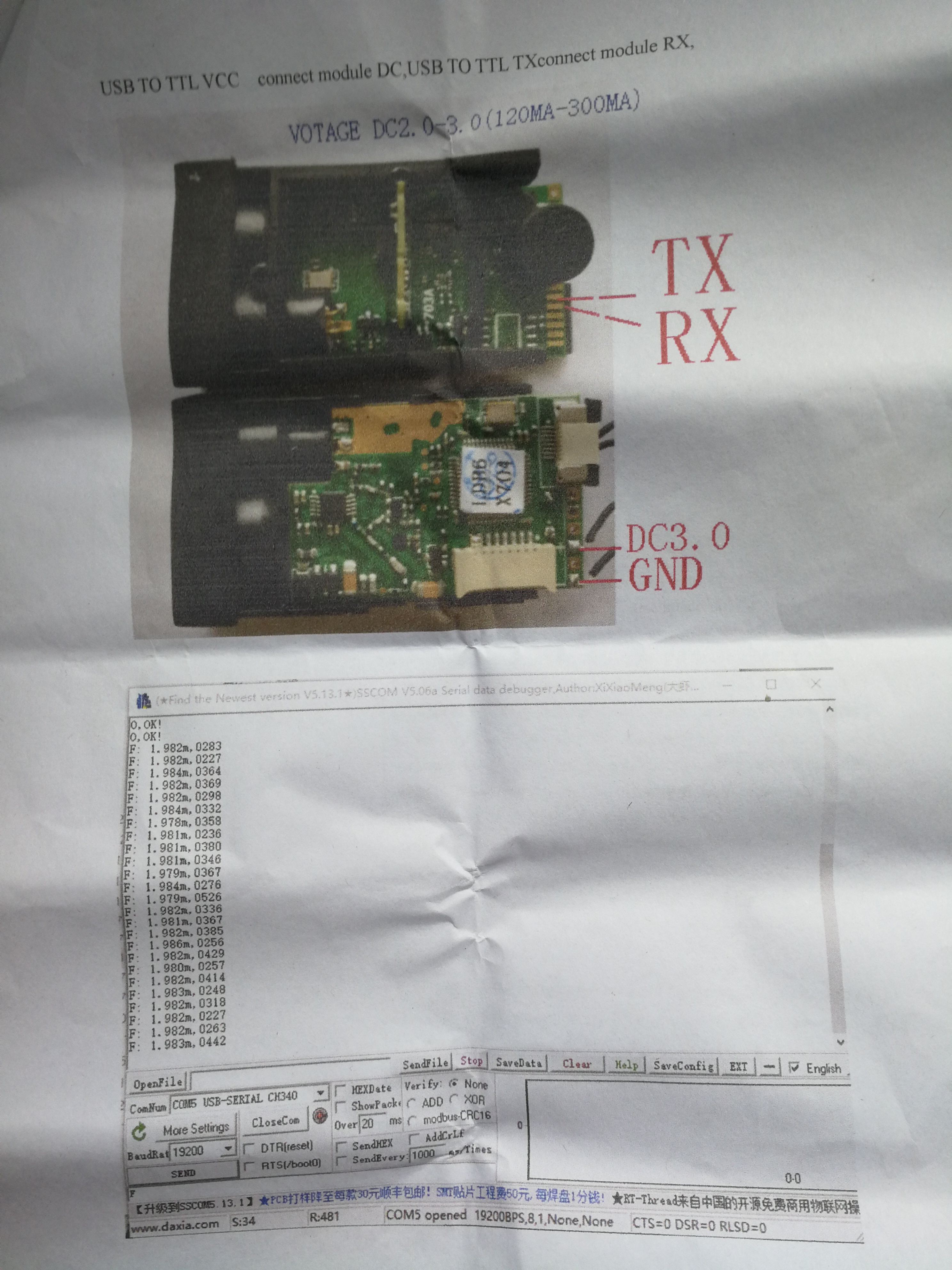 takyto vystup som mal ked som to pripojil cez usb ttl na pc: 1.982m, 0442 a tak dalej...