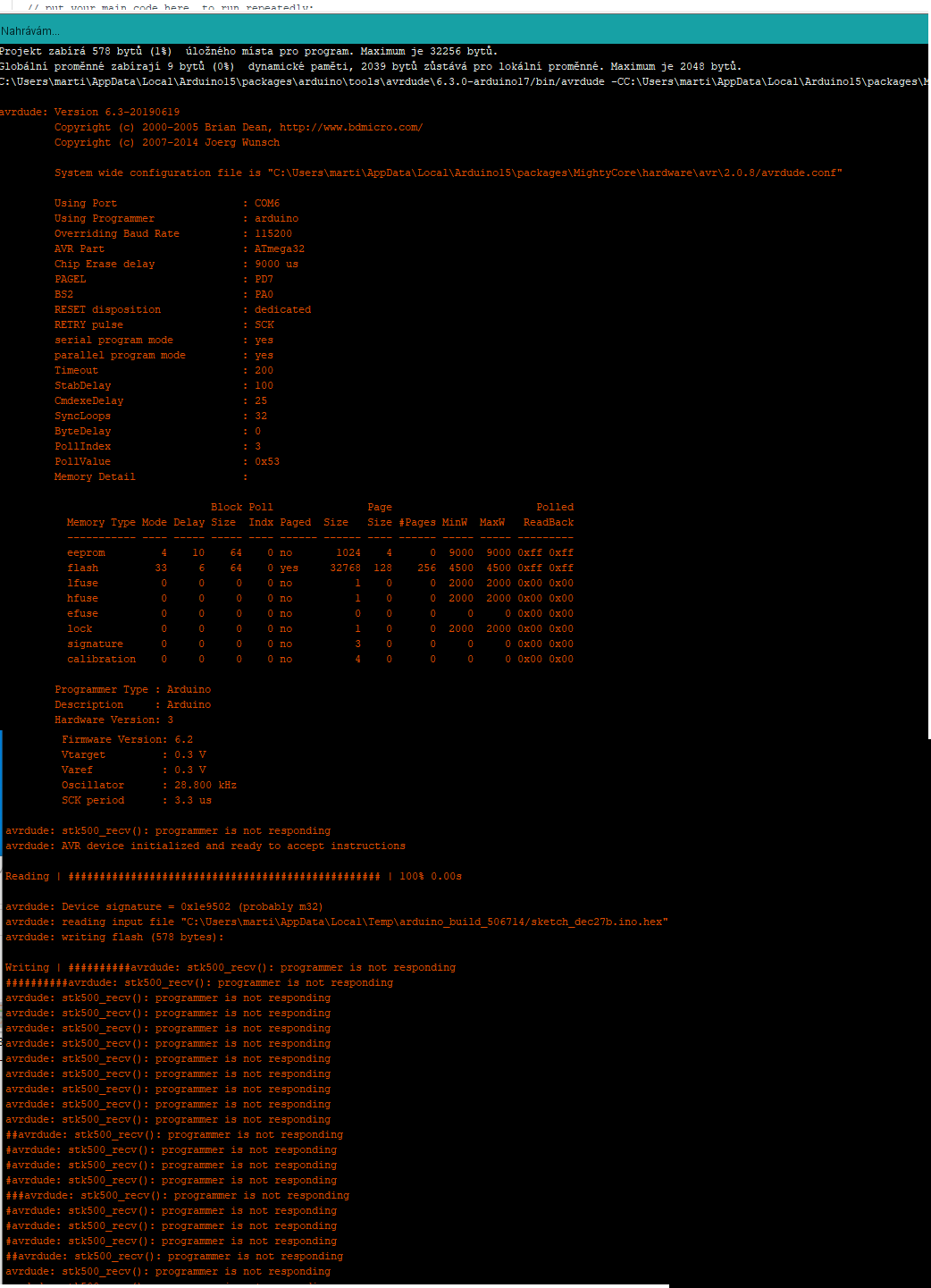 Potřeboval bych nahrát svůj sketch z IDE do ATMega32 (Čína). Mám nainstalovaný MightyCore, bootloader asi mám nahraný (IDE nenahlásilo po ukončení vypalování bootloaderu žádnou chybu). Ale nedaří se mi nahrát sketch, vždy to skončí chybou.