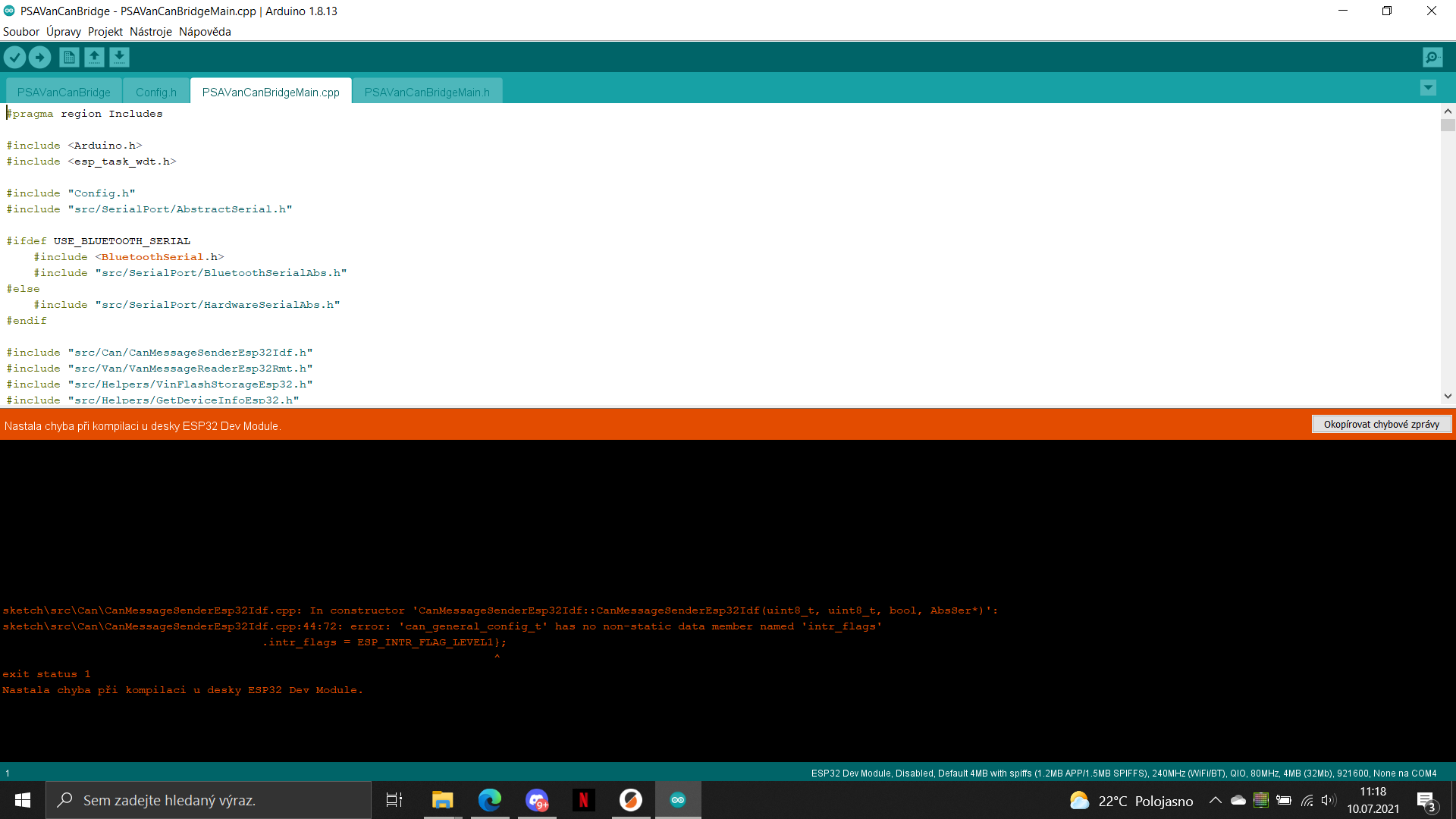 Nastala chyba při kompilaci u desky ESP32 Dev Module.