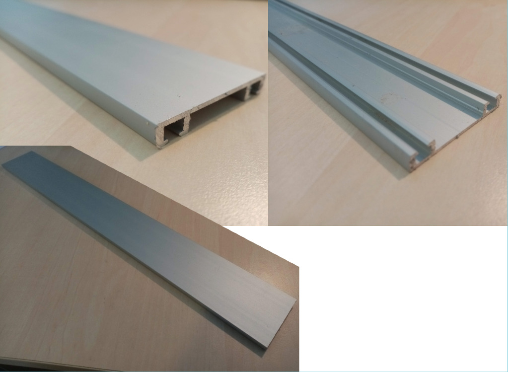 Rovněž ze sortimentu hliníkových profilů pro nábytkové skříně pochází krycí hliníkové lišty, jako tato co mám odřezek: