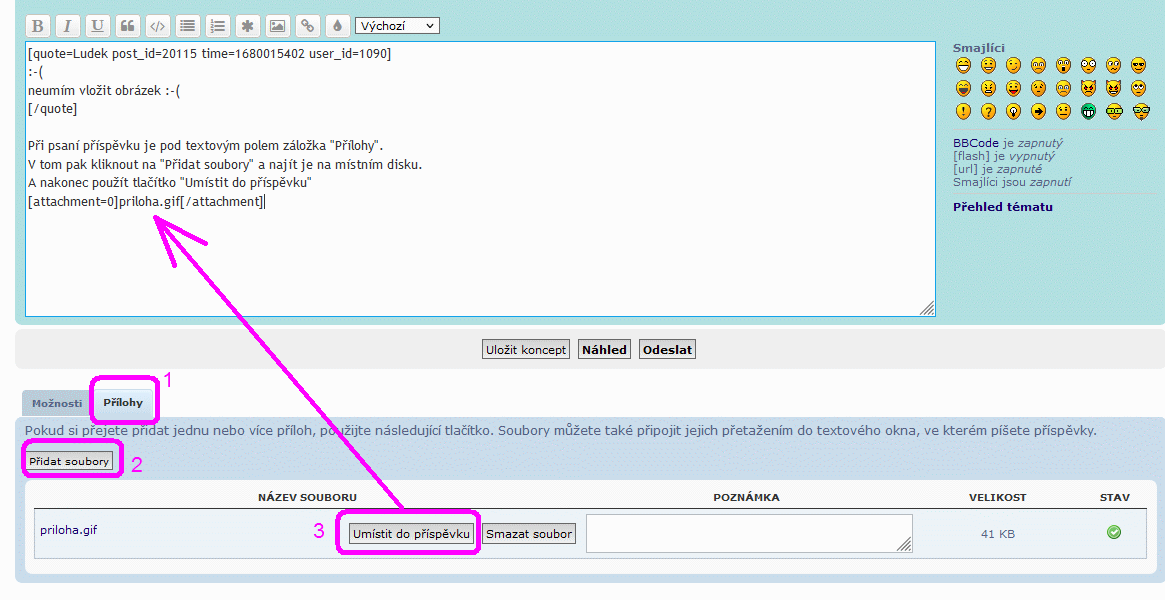 Při psaní příspěvku je pod textovým polem záložka "Přílohy".