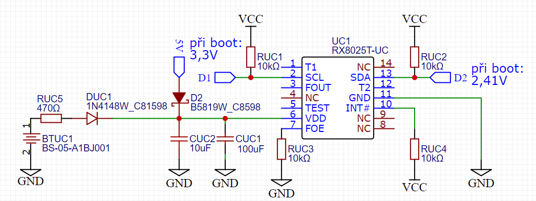 Testoval jsem zapojení na dvou zařízení, kde u jednoho jsem nakonec odpájel pullup rezistory u D1 a D2 - to nakonec pomohlo - ještě ale budu testovat jestli to bylo opravdu tím. Rezistory D1 a D2 mám na plošném spoji umístěny hned u vstupu D1 a D2 ESP. Máte s tím nějaké zkušenosti? Pro mě je to první projekt s komunikaci I2C.