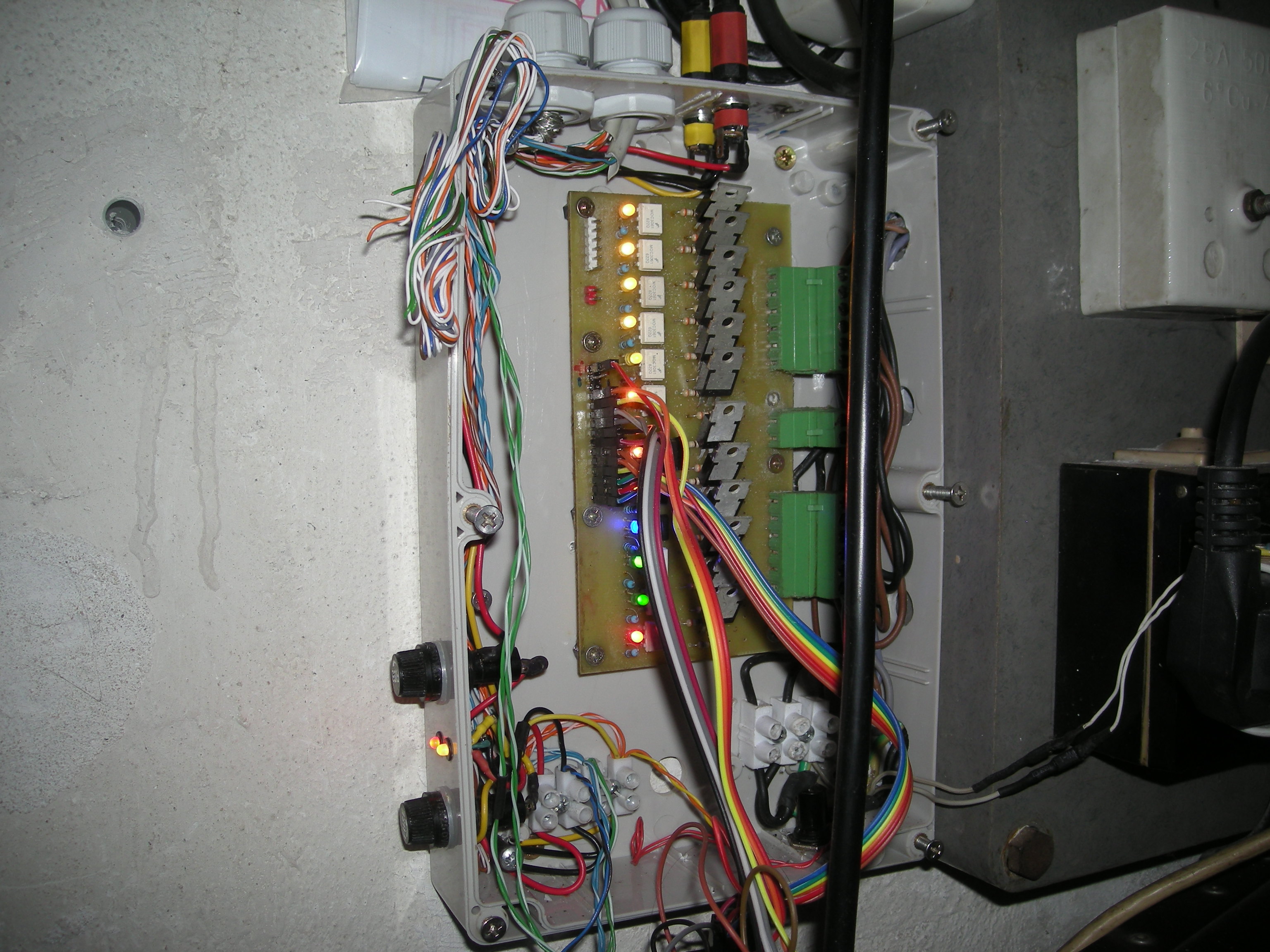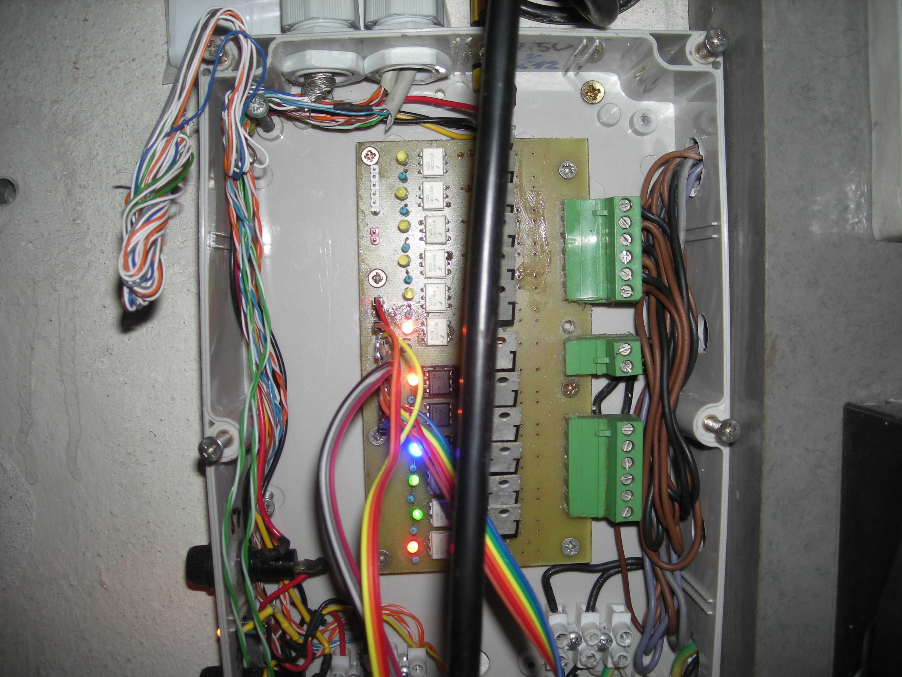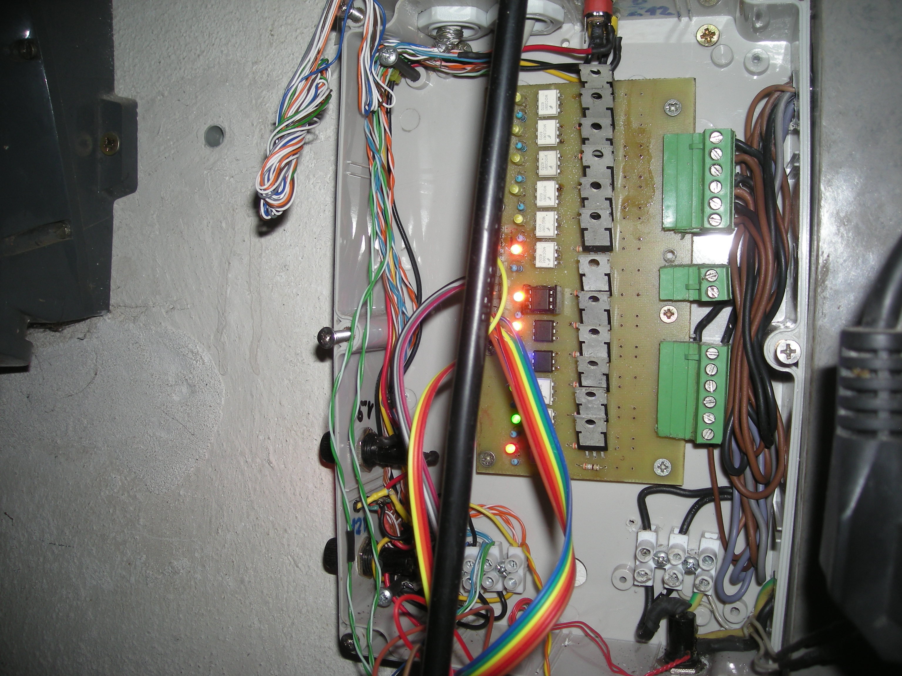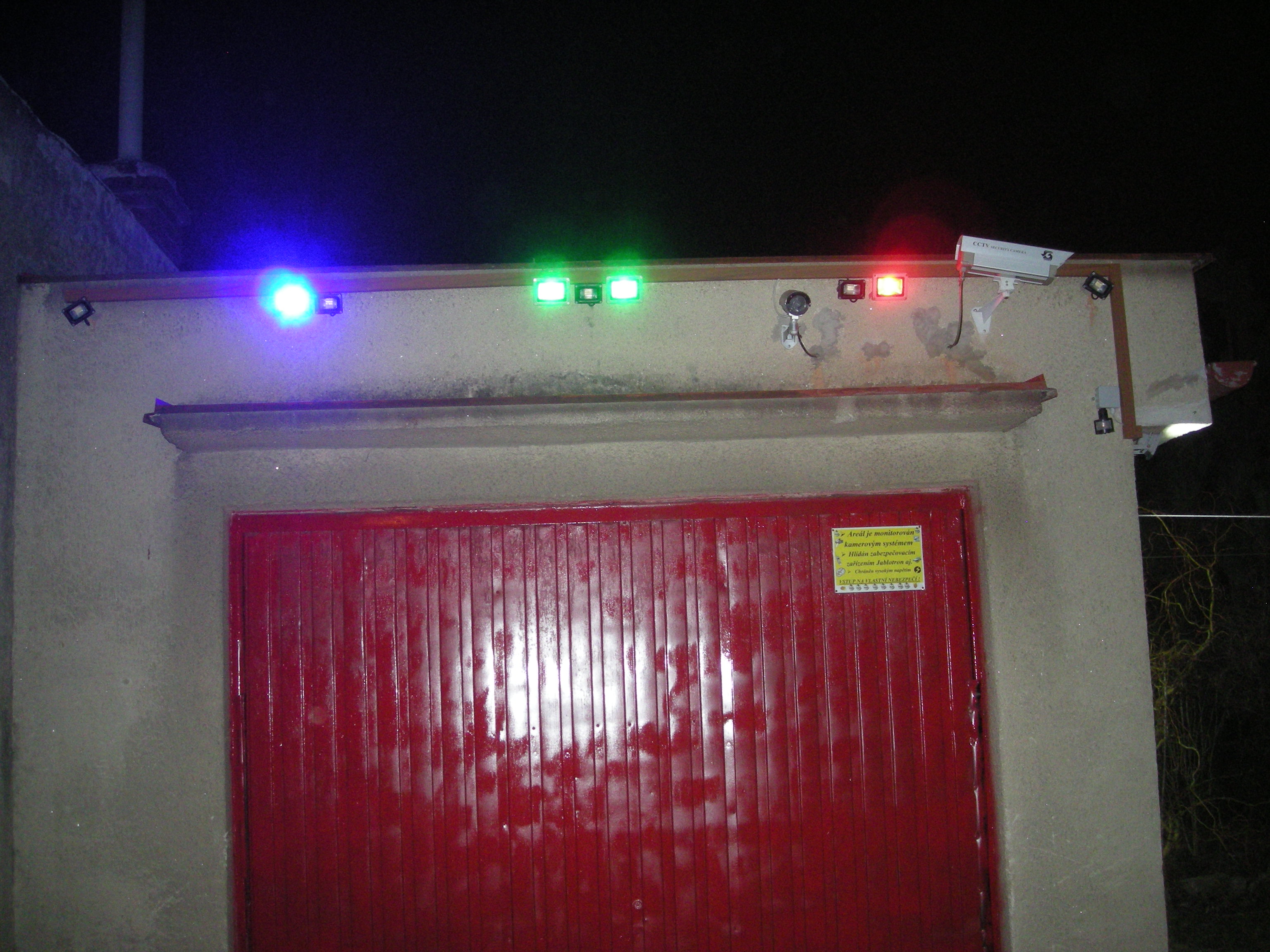 Přidávám fotky.....na prvních 3 je jedna strana garáže se 3mi reflektory (ale v tuto chvíli mám k tomuto čidlu pro legraci spřažené i barevné reflektory z čelní strany garáže - vjezdu), na druhých je vjezd garáže s pěti býlími reflektory + těmi 4mi barevnými pro srandu.....a na dalších je rozvaděč (kde je vše svedeno a už je hotová deska s optočleny a triaky - zatím to místo arduina spínají dvě relátka od čidel a jsou spřaženy 3 reflektory na dvůr a 4 barevné reflektory na vjezd do garáže. To se mi sice moc nelíbí, ale dokud nezvládnu arduino, tak to musí být tak, že když jdu ze dvora, tak ať se mi tři reflektory rozsvítí na cestu a jestě ty 4barevné do ulice (vjezd do garáže). V tuhle chvíli mě nic jiného nenapadá.