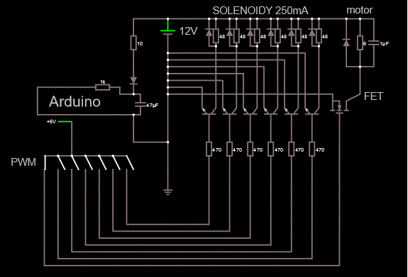Arduino bude napajeno stejnym zdrojem jako motor, takze jsem resil i nejake to odruseni viz schema.